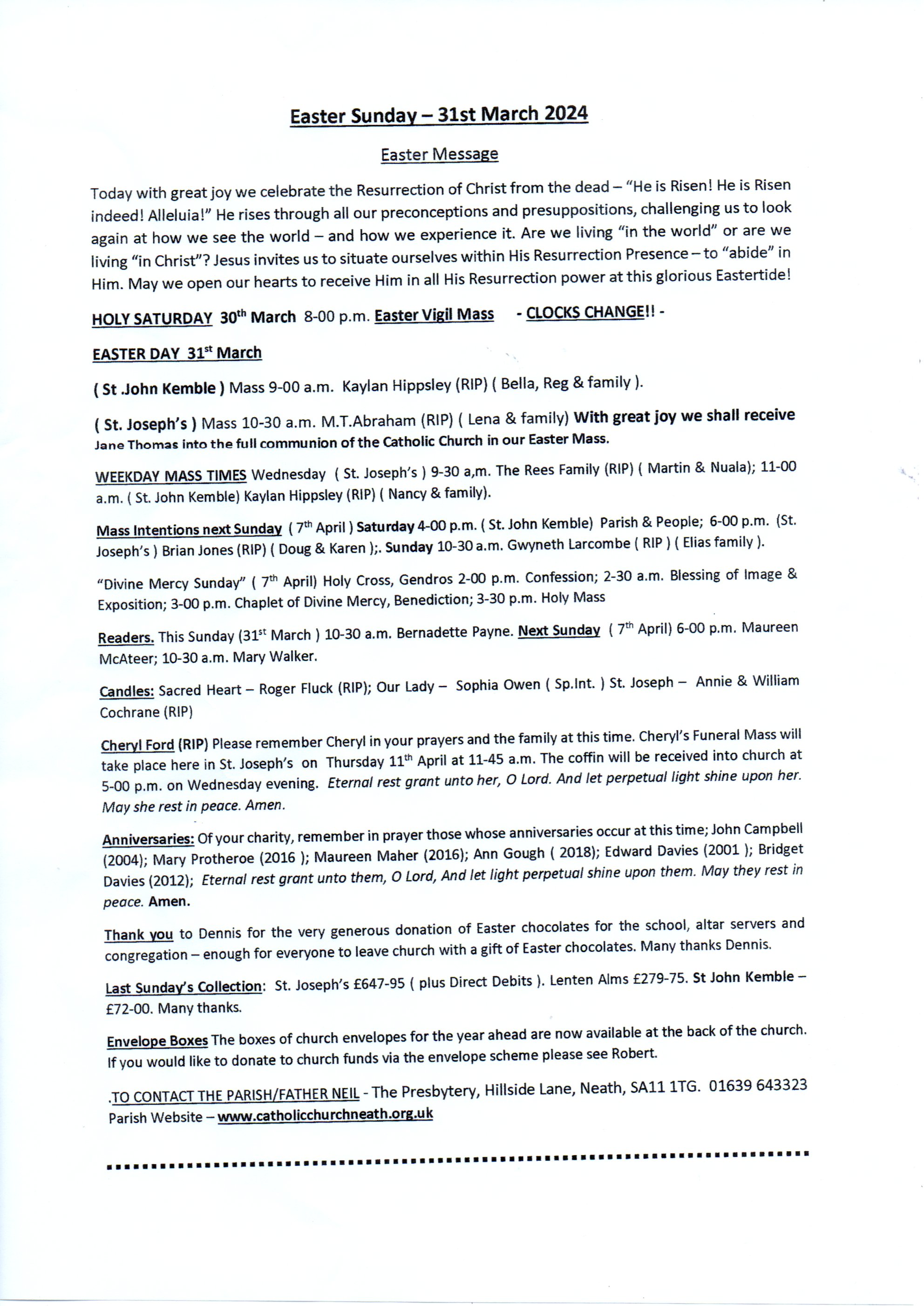 - Parish Synod: the latest news can be found on the Facebook group St Joseph's R C Parish community support.